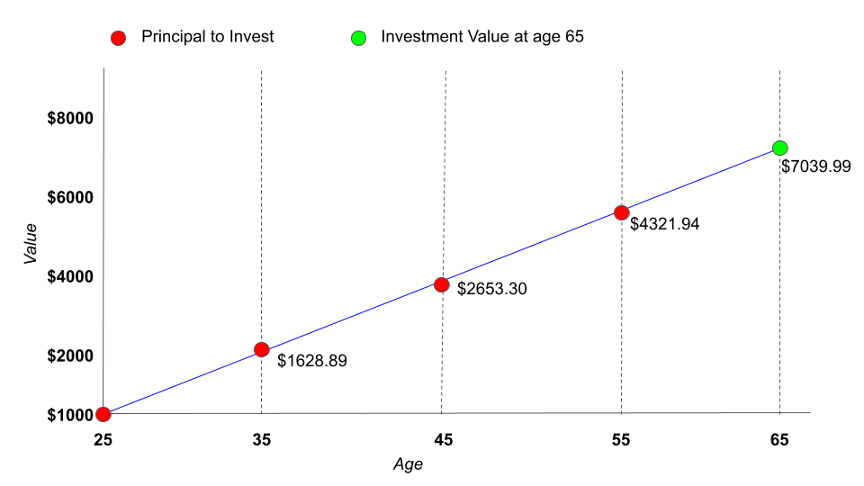 | Start Age | Investment Period (Years) | Principal | Total Investment Value (Principal + Interest) at age 65 |